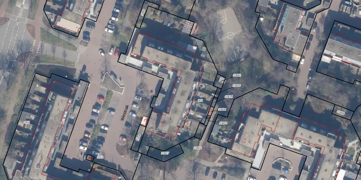 Het perceel waarop Westrak 6 staat heeft een oppervlakte van 2577 m². Dit is een zeer groot perceel. De perceeloppervlakte wordt geregistreerd door het Kadaster. Gedetailleerde informatie over de maten van dit perceel kunt u vinden in het rapport Kadastrale kaart met maatvoering van Westrak 6.