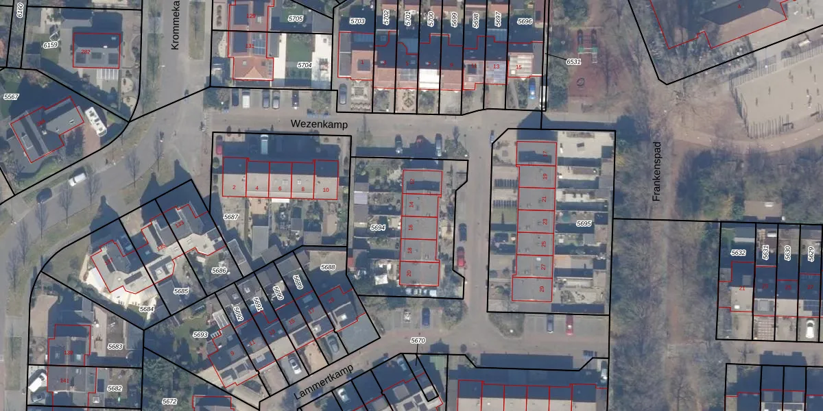 Het perceel waarop Wezenkamp 14 staat heeft een oppervlakte van 891 m². Dit is een groot perceel. De perceeloppervlakte wordt geregistreerd door het Kadaster. Gedetailleerde informatie over de maten van dit perceel kunt u vinden in het rapport Kadastrale kaart met maatvoering van Wezenkamp 14.