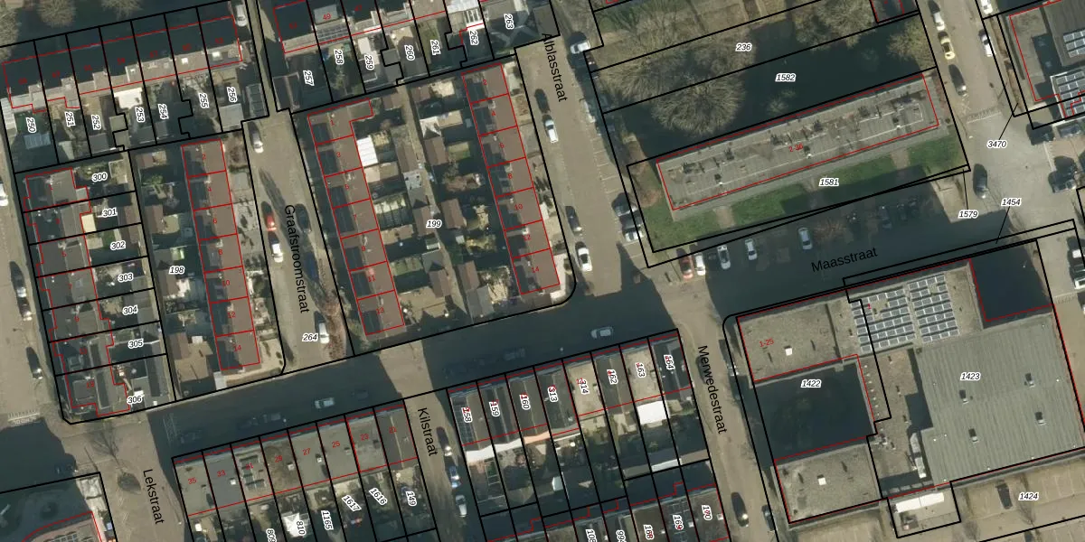 Het perceel waarop Alblasstraat 14 staat heeft een oppervlakte van 1989 m². Dit is een zeer groot perceel. De perceeloppervlakte wordt geregistreerd door het Kadaster. Gedetailleerde informatie over de maten van dit perceel kunt u vinden in het rapport Kadastrale kaart met maatvoering van Alblasstraat 14.