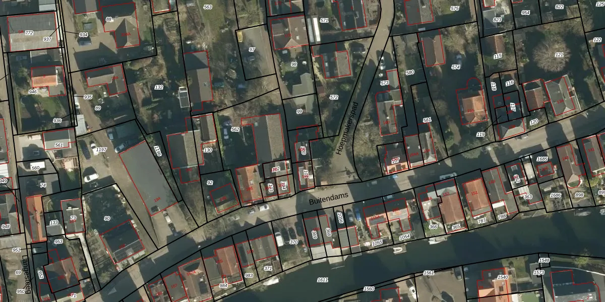 Het perceel waarop Buitendams 168 staat heeft een oppervlakte van 90 m². Dit is een klein perceel. De perceeloppervlakte wordt geregistreerd door het Kadaster. Gedetailleerde informatie over de maten van dit perceel kunt u vinden in het rapport Kadastrale kaart met maatvoering van Buitendams 168.