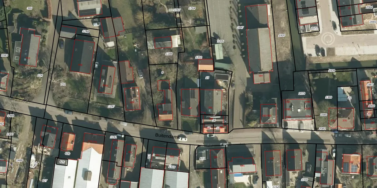 Buitendams 400 is gelegen op kadastraal perceel HDV00K1202. Deze kadastrale aanduiding is uniek en wordt gebruikt door het Kadaster om eigendomsrechten en andere zakelijke rechten vast te leggen. Het perceel maakt onderdeel uit van de kadastrale gemeente Hardinxveld-Giessendam.