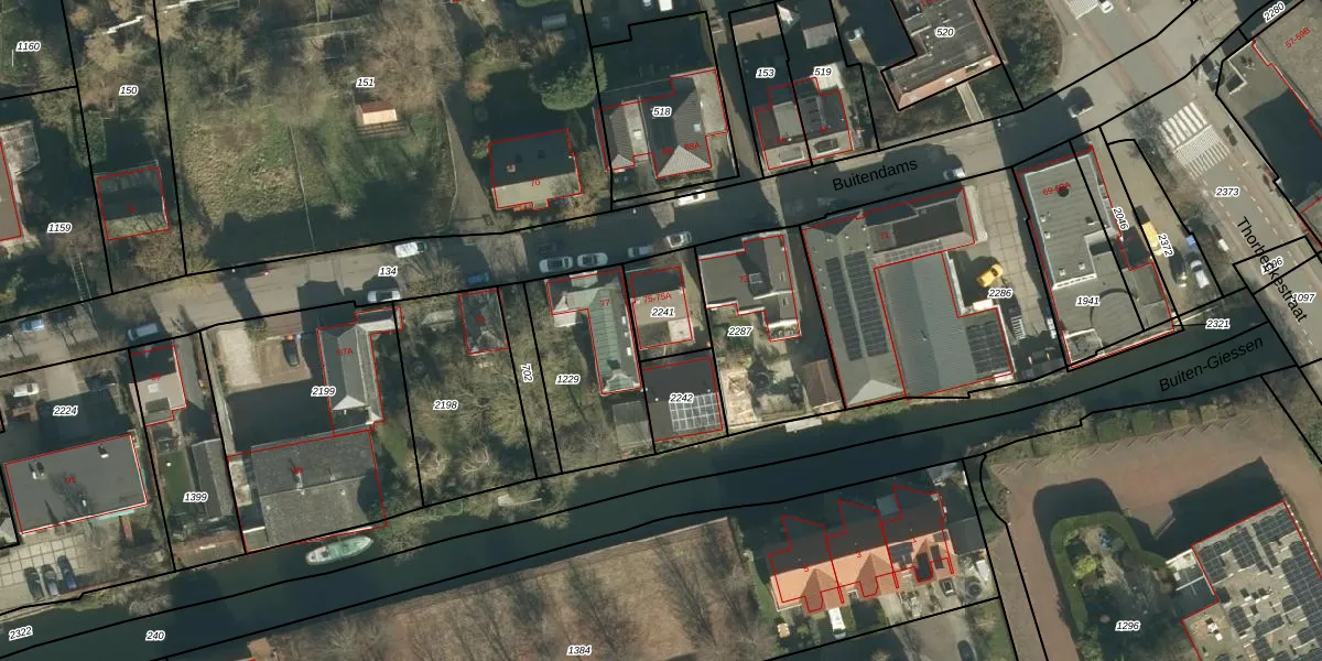 Buitendams 75-A is gelegen op kadastraal perceel HDV00F2241. Deze kadastrale aanduiding is uniek en wordt gebruikt door het Kadaster om eigendomsrechten en andere zakelijke rechten vast te leggen. Het perceel maakt onderdeel uit van de kadastrale gemeente Hardinxveld-Giessendam.