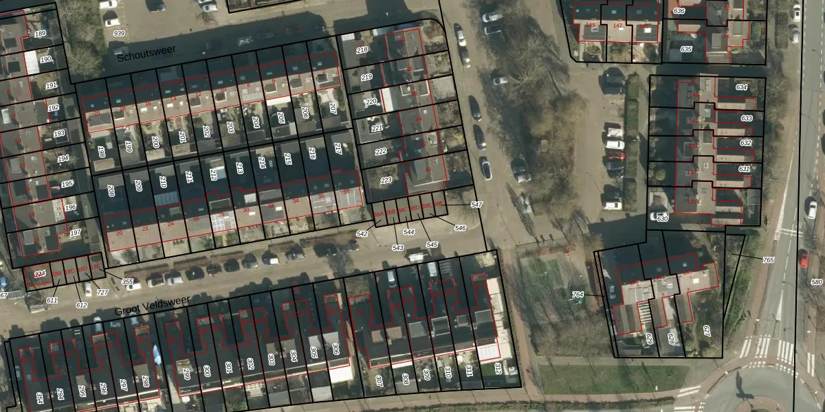 Het perceel waarop Groot Veldsweer 38-D staat heeft een oppervlakte van 18 m². Dit is een klein perceel. De perceeloppervlakte wordt geregistreerd door het Kadaster. Gedetailleerde informatie over de maten van dit perceel kunt u vinden in het rapport Kadastrale kaart met maatvoering van Groot Veldsweer 38-D.