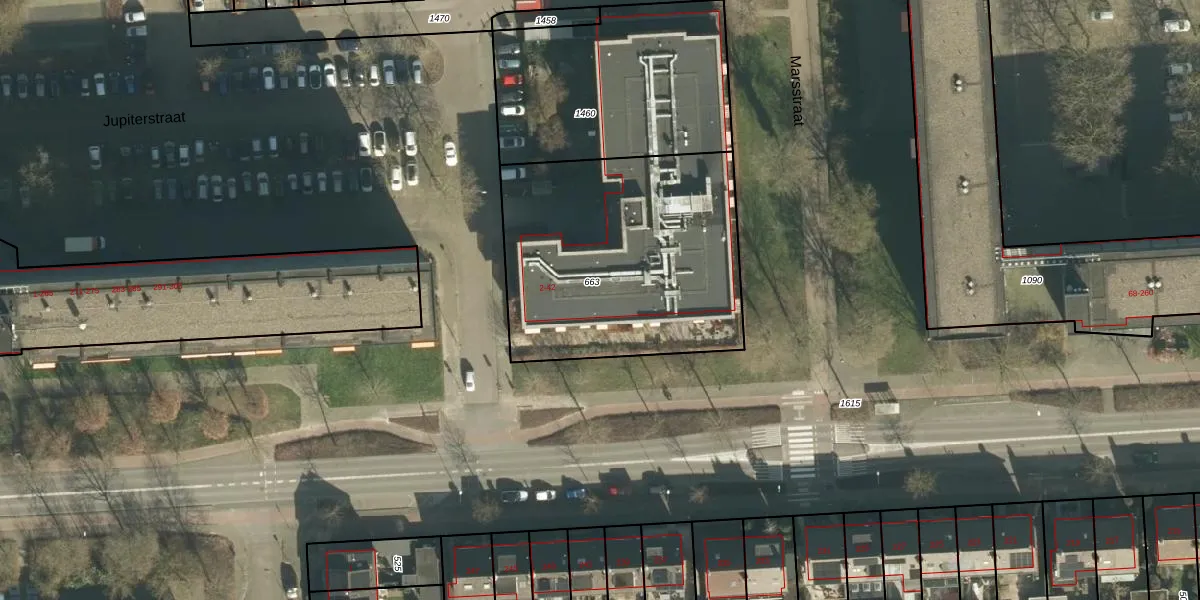 Het perceel waarop Jupiterstraat 6 staat heeft een oppervlakte van 1287 m². Dit is een zeer groot perceel. De perceeloppervlakte wordt geregistreerd door het Kadaster. Gedetailleerde informatie over de maten van dit perceel kunt u vinden in het rapport Kadastrale kaart met maatvoering van Jupiterstraat 6.