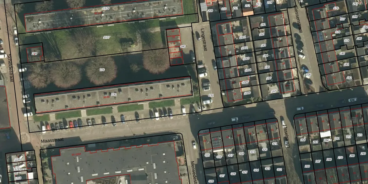 Het perceel waarop Maasstraat 42 staat heeft een oppervlakte van 915 m². Dit is een groot perceel. De perceeloppervlakte wordt geregistreerd door het Kadaster. Gedetailleerde informatie over de maten van dit perceel kunt u vinden in het rapport Kadastrale kaart met maatvoering van Maasstraat 42.