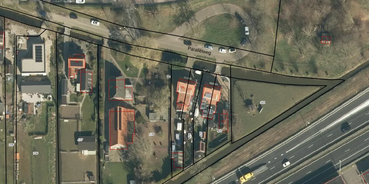 Het perceel waarop Parallelweg 170 staat heeft een oppervlakte van 445 m². Dit is een groot perceel. De perceeloppervlakte wordt geregistreerd door het Kadaster. Gedetailleerde informatie over de maten van dit perceel kunt u vinden in het rapport Kadastrale kaart met maatvoering van Parallelweg 170.