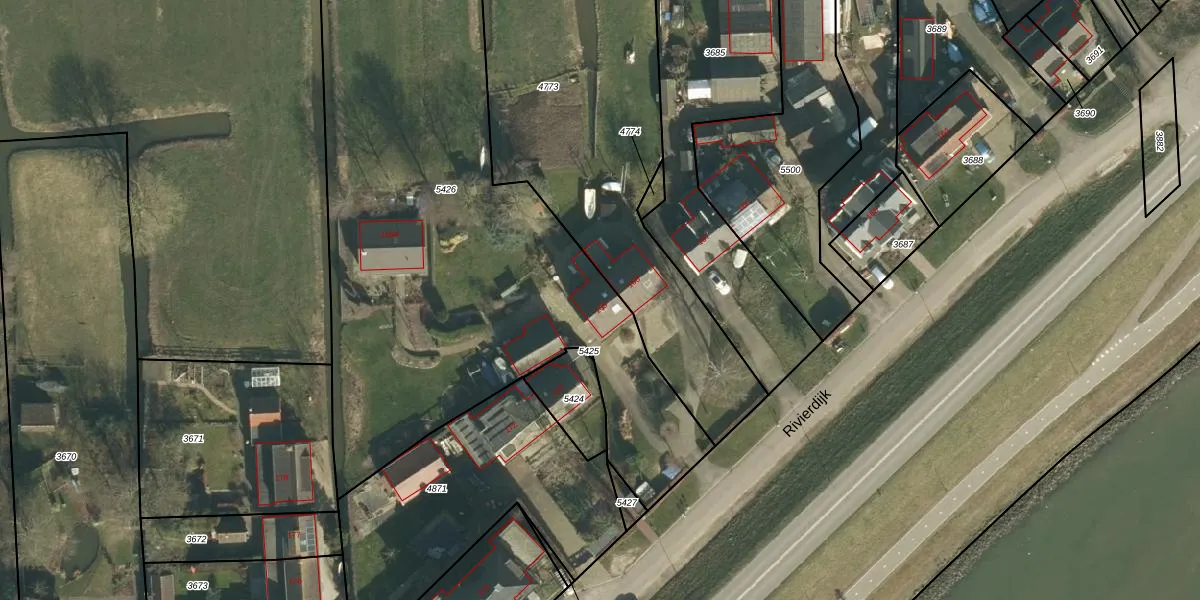 Het perceel waarop Rivierdijk 169 staat heeft een oppervlakte van 3656 m². Dit is een zeer groot perceel. De perceeloppervlakte wordt geregistreerd door het Kadaster. Gedetailleerde informatie over de maten van dit perceel kunt u vinden in het rapport Kadastrale kaart met maatvoering van Rivierdijk 169.
