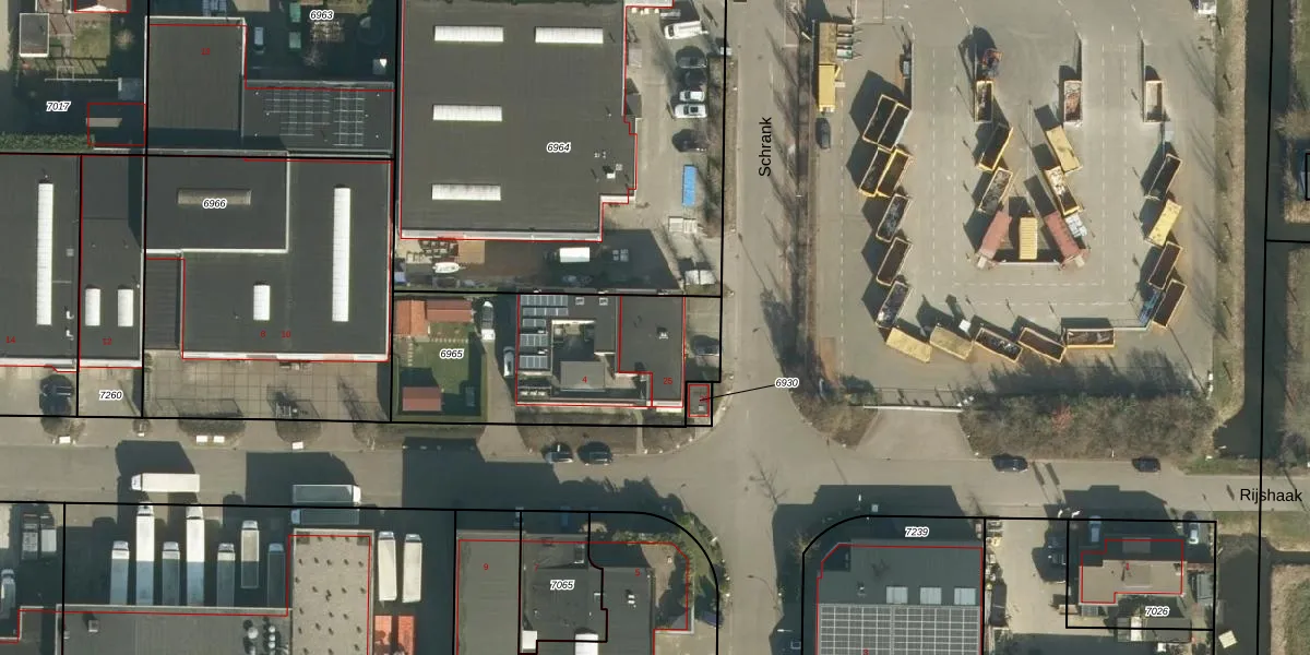Het perceel waarop Schrank 25 staat heeft een oppervlakte van 965 m². Dit is een groot perceel. De perceeloppervlakte wordt geregistreerd door het Kadaster. Gedetailleerde informatie over de maten van dit perceel kunt u vinden in het rapport Kadastrale kaart met maatvoering van Schrank 25.