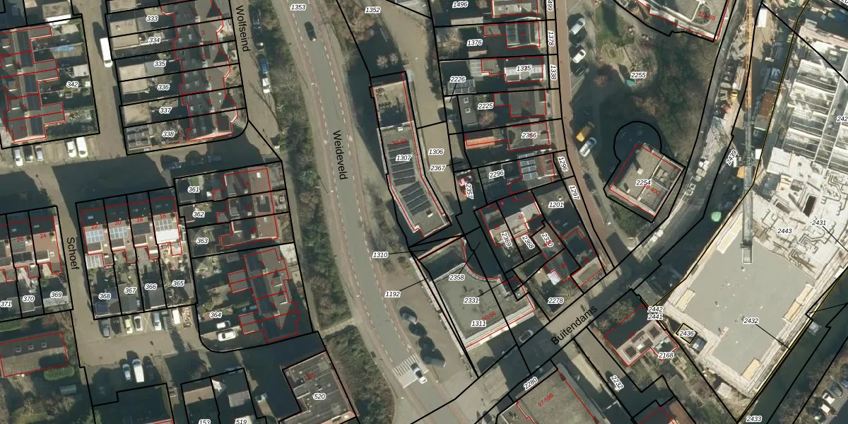 Het perceel waarop Weideveld 44 staat heeft een oppervlakte van 370 m². Dit is een groot perceel. De perceeloppervlakte wordt geregistreerd door het Kadaster. Gedetailleerde informatie over de maten van dit perceel kunt u vinden in het rapport Kadastrale kaart met maatvoering van Weideveld 44.