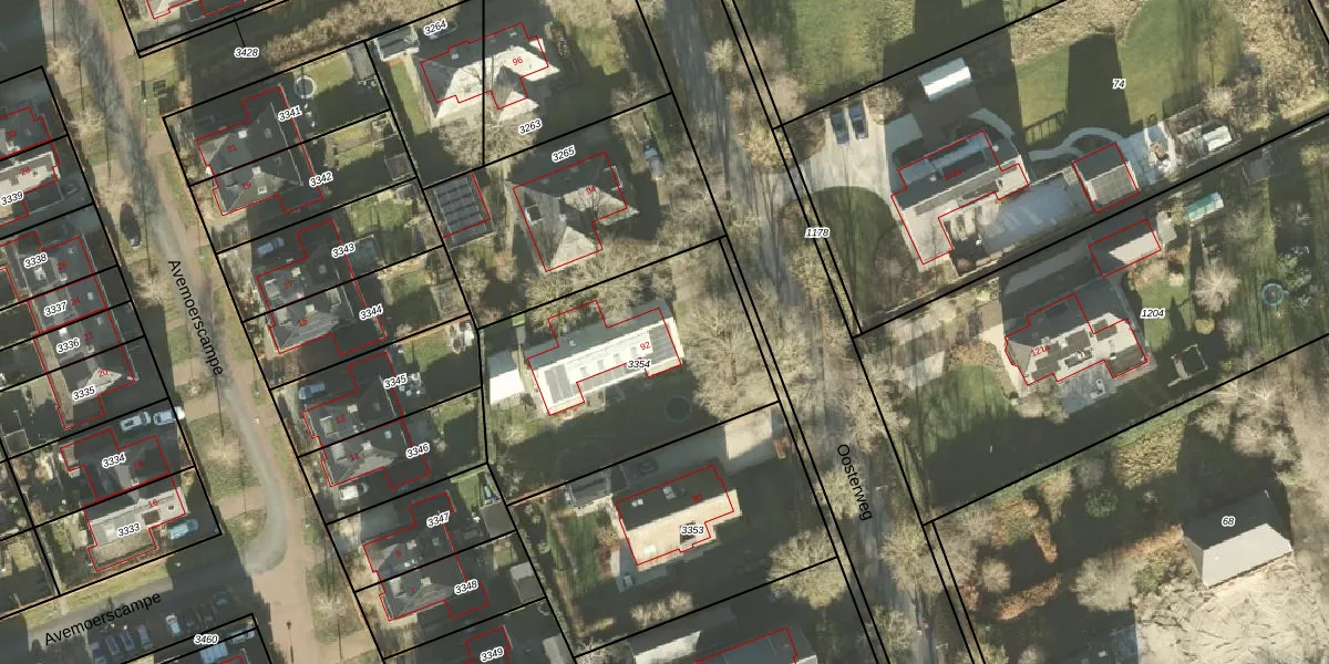 Oosterweg 92 is gelegen op kadastraal perceel HRN01M3354. Deze kadastrale aanduiding is uniek en wordt gebruikt door het Kadaster om eigendomsrechten en andere zakelijke rechten vast te leggen. Het perceel maakt onderdeel uit van de kadastrale gemeente Haren.