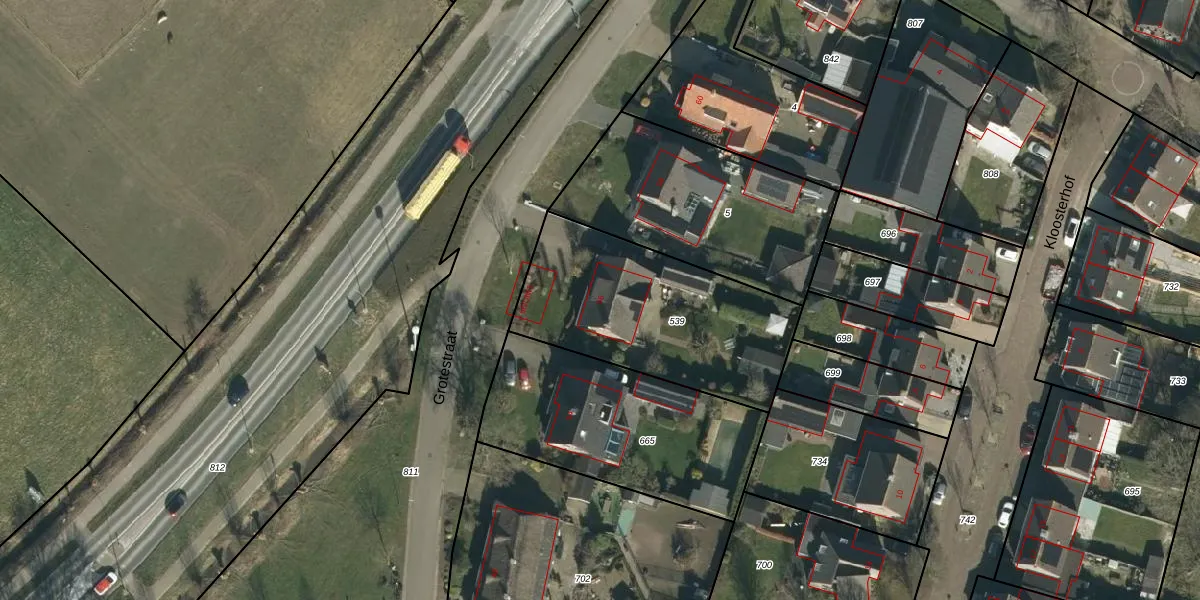 Het perceel waarop Grotestraat 56 staat heeft een oppervlakte van 900 m². Dit is een groot perceel. De perceeloppervlakte wordt geregistreerd door het Kadaster. Gedetailleerde informatie over de maten van dit perceel kunt u vinden in het rapport Kadastrale kaart met maatvoering van Grotestraat 56.