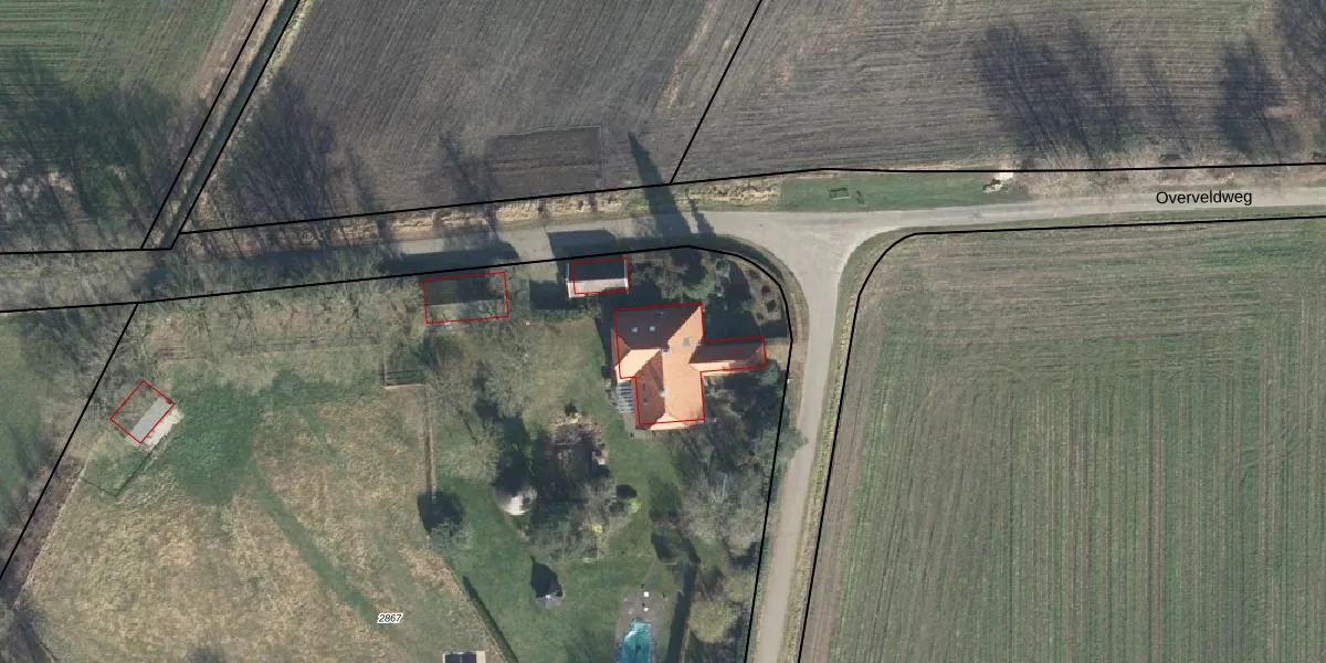 Overveldweg 1 is gelegen op kadastraal perceel AMN00B2867. Deze kadastrale aanduiding is uniek en wordt gebruikt door het Kadaster om eigendomsrechten en andere zakelijke rechten vast te leggen. Het perceel maakt onderdeel uit van de kadastrale gemeente Almen.