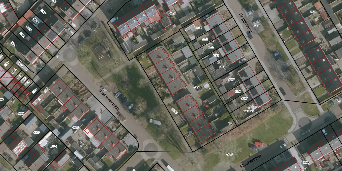 Het perceel waarop Boekweitstrjitte 59 staat heeft een oppervlakte van 1956 m². Dit is een zeer groot perceel. De perceeloppervlakte wordt geregistreerd door het Kadaster. Gedetailleerde informatie over de maten van dit perceel kunt u vinden in het rapport Kadastrale kaart met maatvoering van Boekweitstrjitte 59.