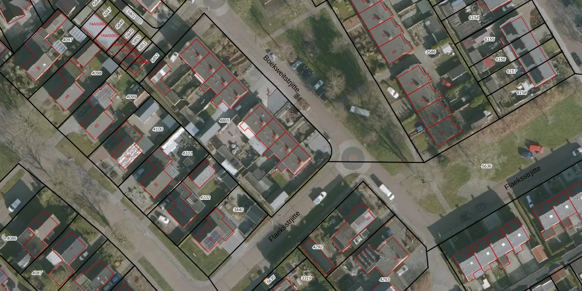 Het perceel waarop Boekweitstrjitte 88 staat heeft een oppervlakte van 2092 m². Dit is een zeer groot perceel. De perceeloppervlakte wordt geregistreerd door het Kadaster. Gedetailleerde informatie over de maten van dit perceel kunt u vinden in het rapport Kadastrale kaart met maatvoering van Boekweitstrjitte 88.