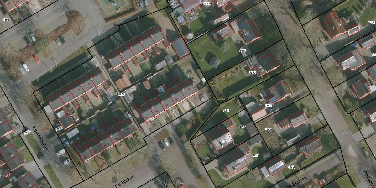 Het perceel waarop De Bjirken 41 staat heeft een oppervlakte van 4610 m². Dit is een zeer groot perceel. De perceeloppervlakte wordt geregistreerd door het Kadaster. Gedetailleerde informatie over de maten van dit perceel kunt u vinden in het rapport Kadastrale kaart met maatvoering van De Bjirken 41.
