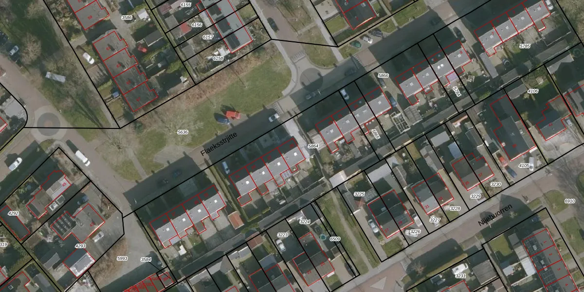 Het perceel waarop Flaeksstrjitte 25 staat heeft een oppervlakte van 2326 m². Dit is een zeer groot perceel. De perceeloppervlakte wordt geregistreerd door het Kadaster. Gedetailleerde informatie over de maten van dit perceel kunt u vinden in het rapport Kadastrale kaart met maatvoering van Flaeksstrjitte 25.