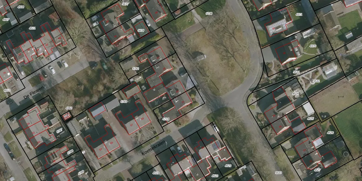 Het perceel waarop Koetsekralen 63 staat heeft een oppervlakte van 2050 m². Dit is een zeer groot perceel. De perceeloppervlakte wordt geregistreerd door het Kadaster. Gedetailleerde informatie over de maten van dit perceel kunt u vinden in het rapport Kadastrale kaart met maatvoering van Koetsekralen 63.