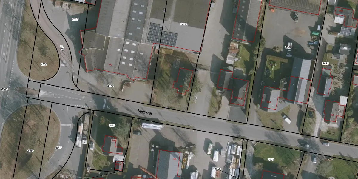Het perceel waarop Nijewei 60 staat heeft een oppervlakte van 1900 m². Dit is een zeer groot perceel. De perceeloppervlakte wordt geregistreerd door het Kadaster. Gedetailleerde informatie over de maten van dit perceel kunt u vinden in het rapport Kadastrale kaart met maatvoering van Nijewei 60.