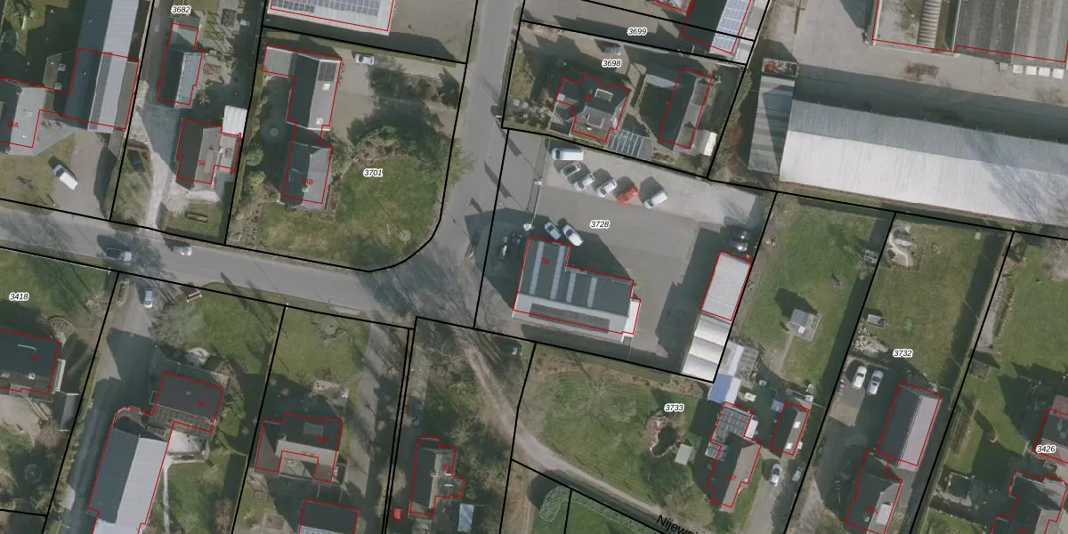 Het perceel waarop Nijewei 85 staat heeft een oppervlakte van 1845 m². Dit is een zeer groot perceel. De perceeloppervlakte wordt geregistreerd door het Kadaster. Gedetailleerde informatie over de maten van dit perceel kunt u vinden in het rapport Kadastrale kaart met maatvoering van Nijewei 85.