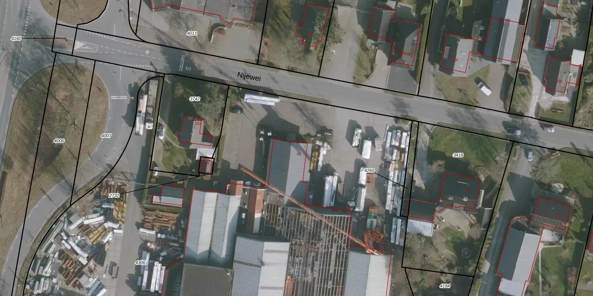 Het perceel waarop Nijewei 99 staat heeft een oppervlakte van 1,1 ha. Dit is een zeer groot perceel. De perceeloppervlakte wordt geregistreerd door het Kadaster. Gedetailleerde informatie over de maten van dit perceel kunt u vinden in het rapport Kadastrale kaart met maatvoering van Nijewei 99.