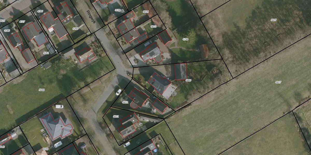 Het perceel waarop Ringwyk 38 staat heeft een oppervlakte van 1300 m². Dit is een zeer groot perceel. De perceeloppervlakte wordt geregistreerd door het Kadaster. Gedetailleerde informatie over de maten van dit perceel kunt u vinden in het rapport Kadastrale kaart met maatvoering van Ringwyk 38.
