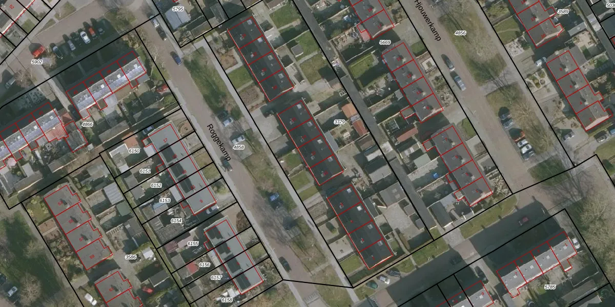 Het perceel waarop Roggekamp 12 staat heeft een oppervlakte van 2922 m². Dit is een zeer groot perceel. De perceeloppervlakte wordt geregistreerd door het Kadaster. Gedetailleerde informatie over de maten van dit perceel kunt u vinden in het rapport Kadastrale kaart met maatvoering van Roggekamp 12.