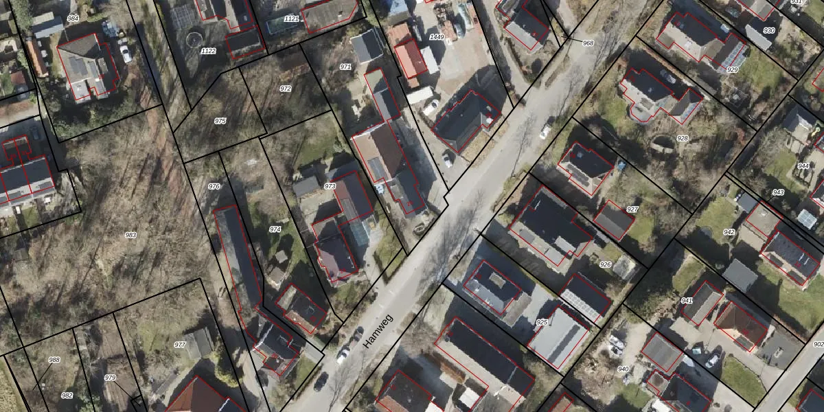Het perceel waarop Hamweg 26 staat heeft een oppervlakte van 950 m². Dit is een groot perceel. De perceeloppervlakte wordt geregistreerd door het Kadaster. Gedetailleerde informatie over de maten van dit perceel kunt u vinden in het rapport Kadastrale kaart met maatvoering van Hamweg 26.