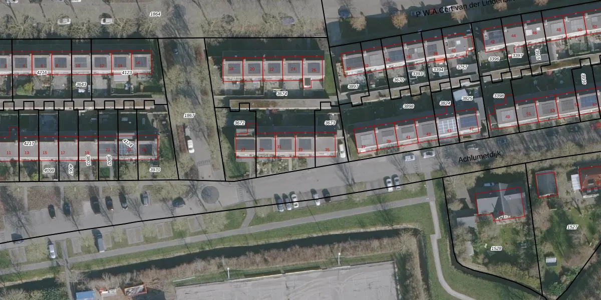 Het perceel waarop Achlumerdijk 33 staat heeft een oppervlakte van 1381 m². Dit is een zeer groot perceel. De perceeloppervlakte wordt geregistreerd door het Kadaster. Gedetailleerde informatie over de maten van dit perceel kunt u vinden in het rapport Kadastrale kaart met maatvoering van Achlumerdijk 33.