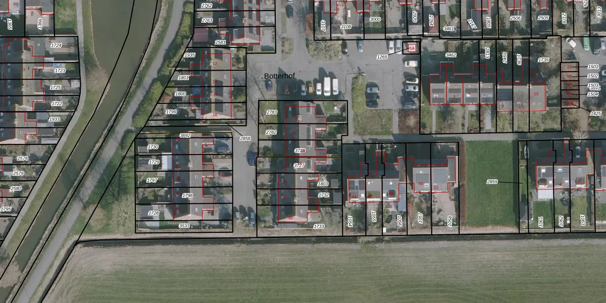 Het perceel waarop Botterhof 38 staat heeft een oppervlakte van 155 m². Dit is een middelgroot perceel. De perceeloppervlakte wordt geregistreerd door het Kadaster. Gedetailleerde informatie over de maten van dit perceel kunt u vinden in het rapport Kadastrale kaart met maatvoering van Botterhof 38.