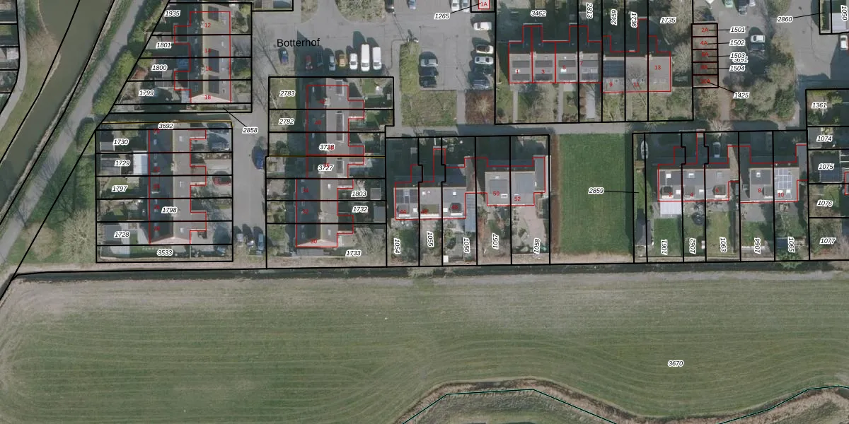 Het perceel waarop Botterhof 46 staat heeft een oppervlakte van 165 m². Dit is een middelgroot perceel. De perceeloppervlakte wordt geregistreerd door het Kadaster. Gedetailleerde informatie over de maten van dit perceel kunt u vinden in het rapport Kadastrale kaart met maatvoering van Botterhof 46.
