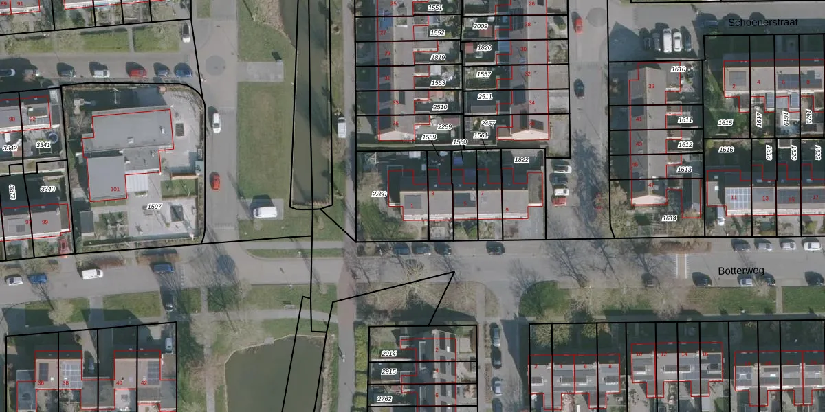 Het perceel waarop Botterweg 1 staat heeft een oppervlakte van 382 m². Dit is een groot perceel. De perceeloppervlakte wordt geregistreerd door het Kadaster. Gedetailleerde informatie over de maten van dit perceel kunt u vinden in het rapport Kadastrale kaart met maatvoering van Botterweg 1.