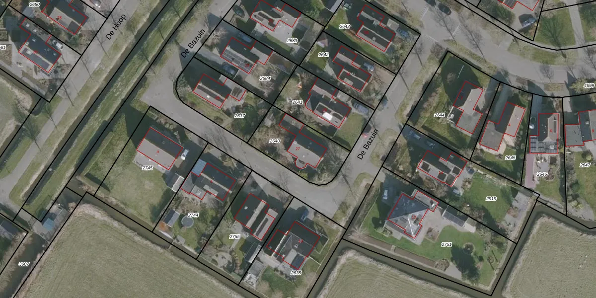 Het perceel waarop De Bazuin 27 staat heeft een oppervlakte van 476 m². Dit is een groot perceel. De perceeloppervlakte wordt geregistreerd door het Kadaster. Gedetailleerde informatie over de maten van dit perceel kunt u vinden in het rapport Kadastrale kaart met maatvoering van De Bazuin 27.