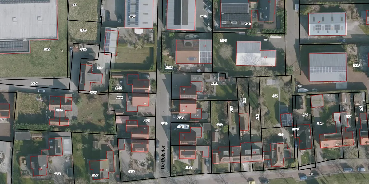Het perceel waarop De Boterton 8 staat heeft een oppervlakte van 519 m². Dit is een groot perceel. De perceeloppervlakte wordt geregistreerd door het Kadaster. Gedetailleerde informatie over de maten van dit perceel kunt u vinden in het rapport Kadastrale kaart met maatvoering van De Boterton 8.