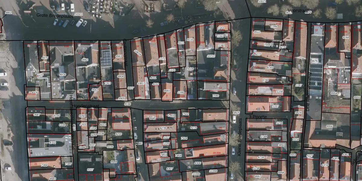 Het perceel waarop Hondenstraat 13-A staat heeft een oppervlakte van 84 m². Dit is een klein perceel. De perceeloppervlakte wordt geregistreerd door het Kadaster. Gedetailleerde informatie over de maten van dit perceel kunt u vinden in het rapport Kadastrale kaart met maatvoering van Hondenstraat 13-A.
