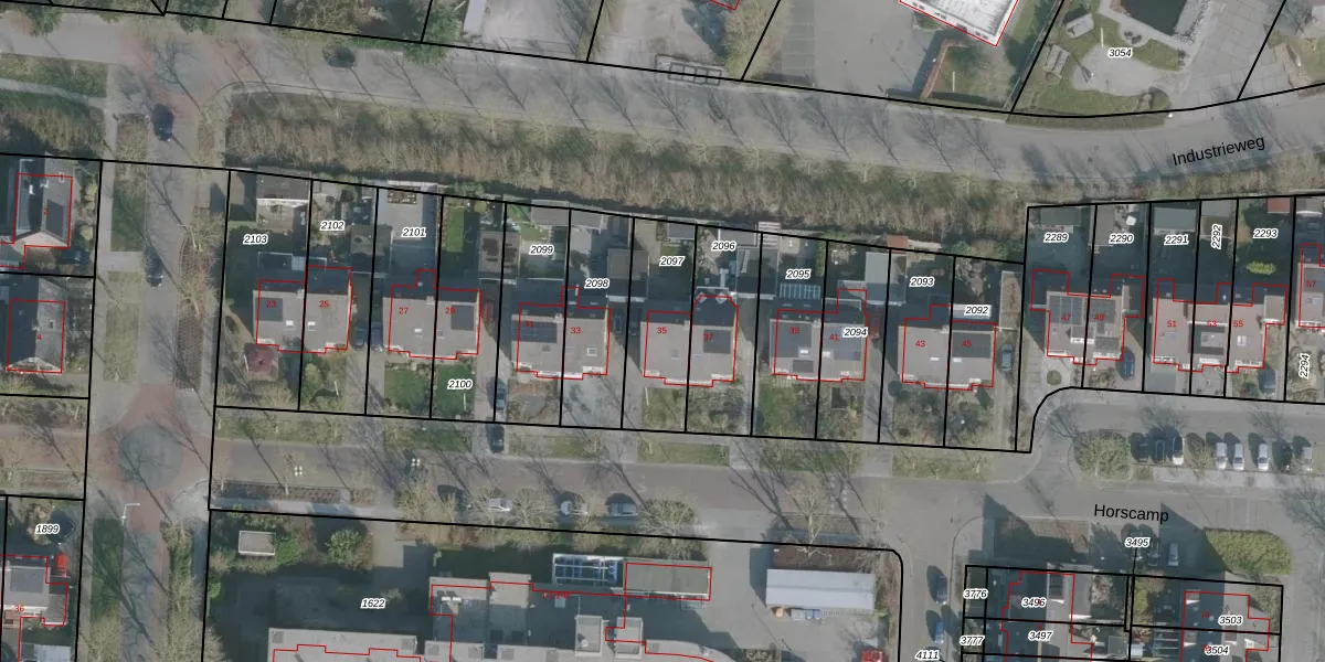 Het perceel waarop Horscamp 35 staat heeft een oppervlakte van 311 m². Dit is een groot perceel. De perceeloppervlakte wordt geregistreerd door het Kadaster. Gedetailleerde informatie over de maten van dit perceel kunt u vinden in het rapport Kadastrale kaart met maatvoering van Horscamp 35.