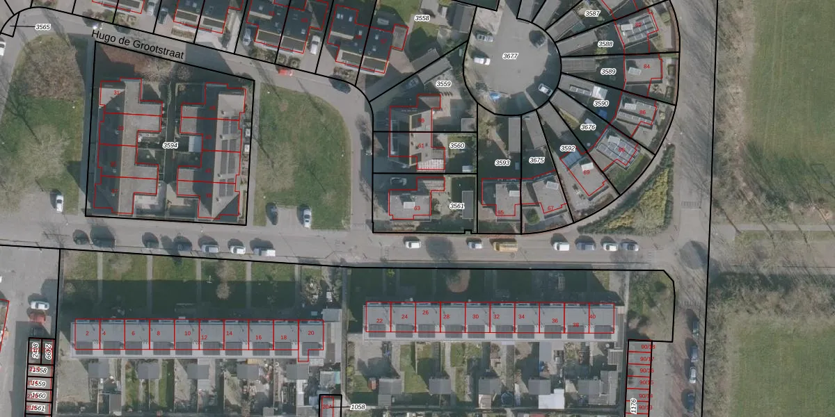 Het perceel waarop Hugo de Grootstraat 63 staat heeft een oppervlakte van 360 m². Dit is een groot perceel. De perceeloppervlakte wordt geregistreerd door het Kadaster. Gedetailleerde informatie over de maten van dit perceel kunt u vinden in het rapport Kadastrale kaart met maatvoering van Hugo de Grootstraat 63.
