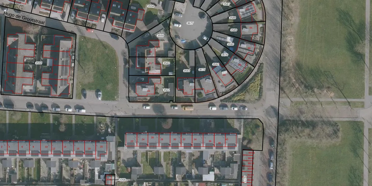 Hugo de Grootstraat 65 is gelegen op kadastraal perceel HLG02B3593. Deze kadastrale aanduiding is uniek en wordt gebruikt door het Kadaster om eigendomsrechten en andere zakelijke rechten vast te leggen. Het perceel maakt onderdeel uit van de kadastrale gemeente Harlingen.