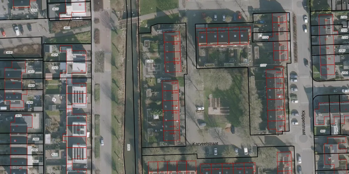 Het perceel waarop Karveelstraat 40 staat heeft een oppervlakte van 1815 m². Dit is een zeer groot perceel. De perceeloppervlakte wordt geregistreerd door het Kadaster. Gedetailleerde informatie over de maten van dit perceel kunt u vinden in het rapport Kadastrale kaart met maatvoering van Karveelstraat 40.