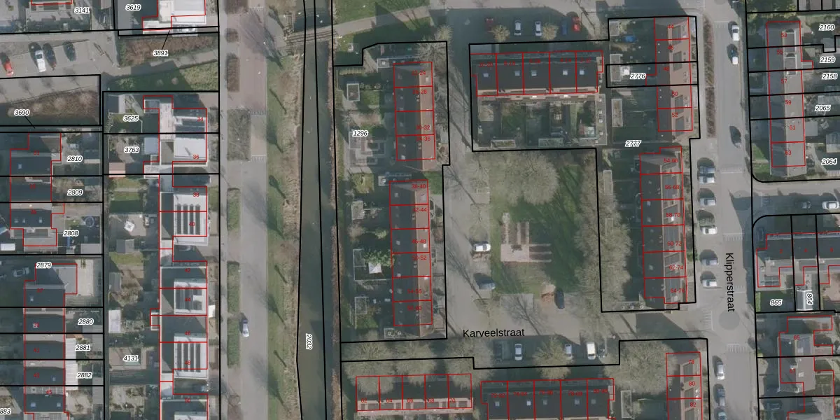 Het perceel waarop Karveelstraat 42 staat heeft een oppervlakte van 1815 m². Dit is een zeer groot perceel. De perceeloppervlakte wordt geregistreerd door het Kadaster. Gedetailleerde informatie over de maten van dit perceel kunt u vinden in het rapport Kadastrale kaart met maatvoering van Karveelstraat 42.