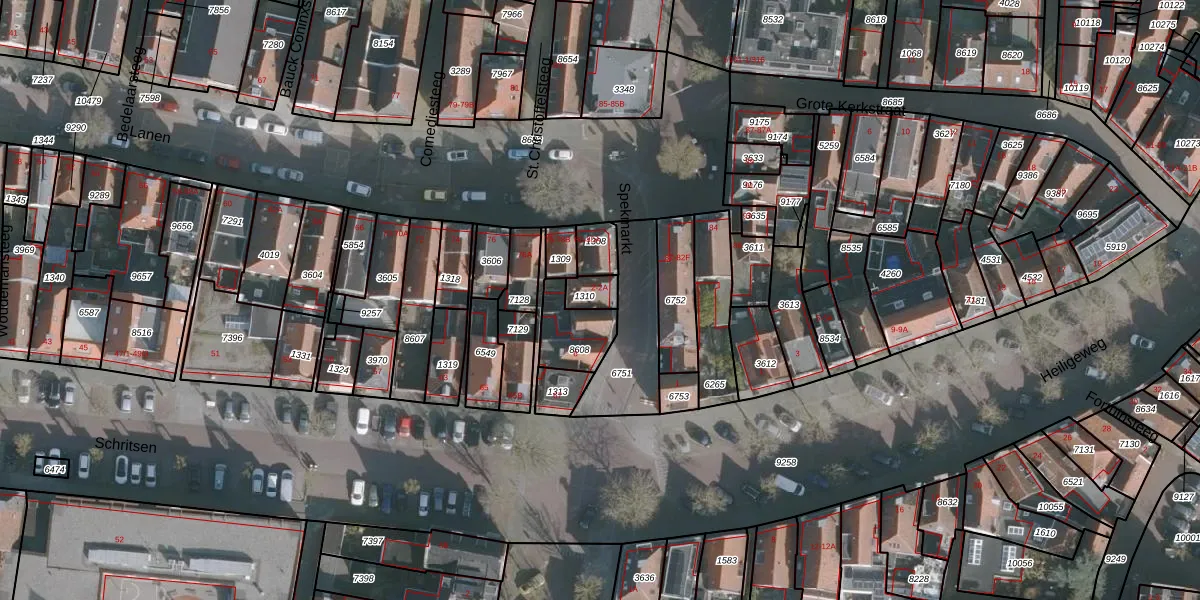 Het perceel waarop Spekmarkt 2-A staat heeft een oppervlakte van 48 m². Dit is een klein perceel. De perceeloppervlakte wordt geregistreerd door het Kadaster. Gedetailleerde informatie over de maten van dit perceel kunt u vinden in het rapport Kadastrale kaart met maatvoering van Spekmarkt 2-A.