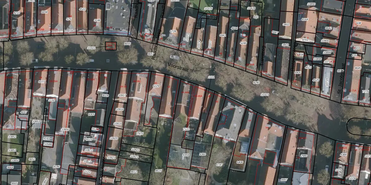 Het perceel waarop Voorstraat 44 staat heeft een oppervlakte van 601 m². Dit is een groot perceel. De perceeloppervlakte wordt geregistreerd door het Kadaster. Gedetailleerde informatie over de maten van dit perceel kunt u vinden in het rapport Kadastrale kaart met maatvoering van Voorstraat 44.
