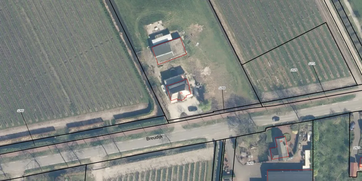 Het perceel waarop Breudijk 21 staat heeft een oppervlakte van 7400 m². Dit is een zeer groot perceel. De perceeloppervlakte wordt geregistreerd door het Kadaster. Gedetailleerde informatie over de maten van dit perceel kunt u vinden in het rapport Kadastrale kaart met maatvoering van Breudijk 21.