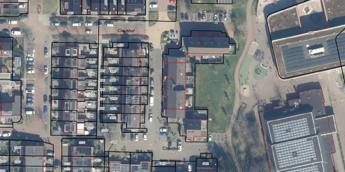 Het perceel waarop Claushof 55 staat heeft een oppervlakte van 1450 m². Dit is een zeer groot perceel. De perceeloppervlakte wordt geregistreerd door het Kadaster. Gedetailleerde informatie over de maten van dit perceel kunt u vinden in het rapport Kadastrale kaart met maatvoering van Claushof 55.