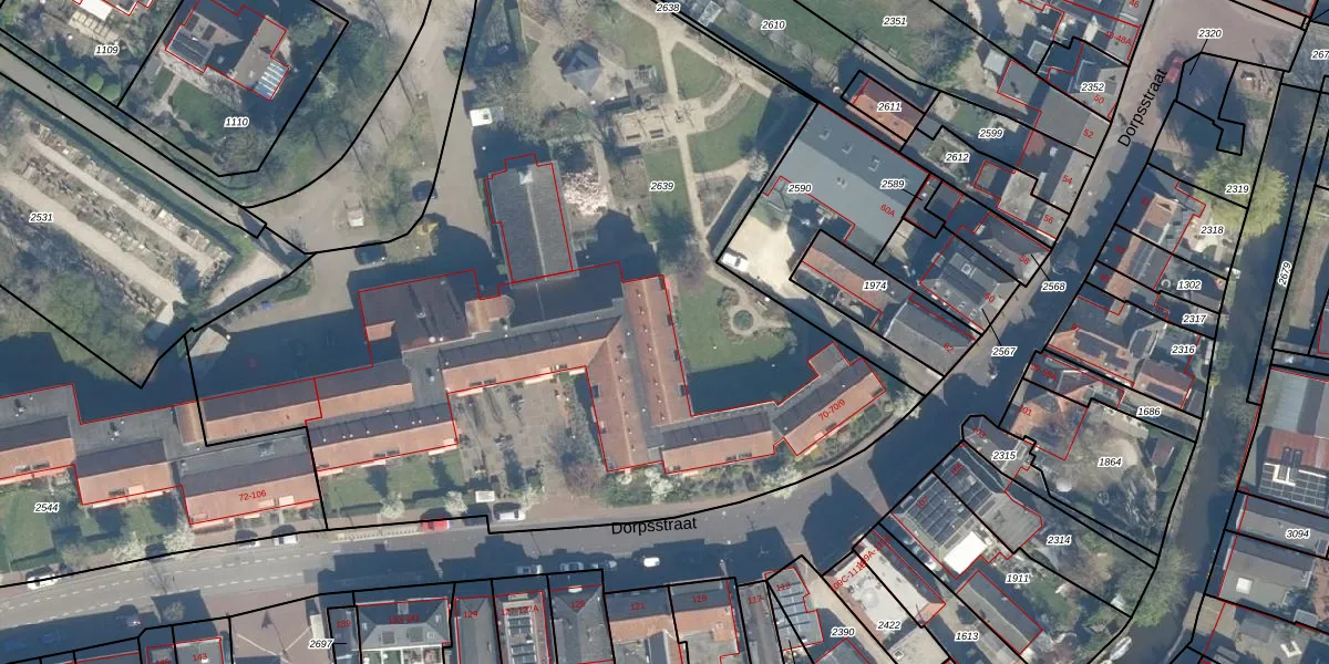 Het perceel waarop Dorpsstraat 70-202 staat heeft een oppervlakte van 5460 m². Dit is een zeer groot perceel. De perceeloppervlakte wordt geregistreerd door het Kadaster. Gedetailleerde informatie over de maten van dit perceel kunt u vinden in het rapport Kadastrale kaart met maatvoering van Dorpsstraat 70-202.