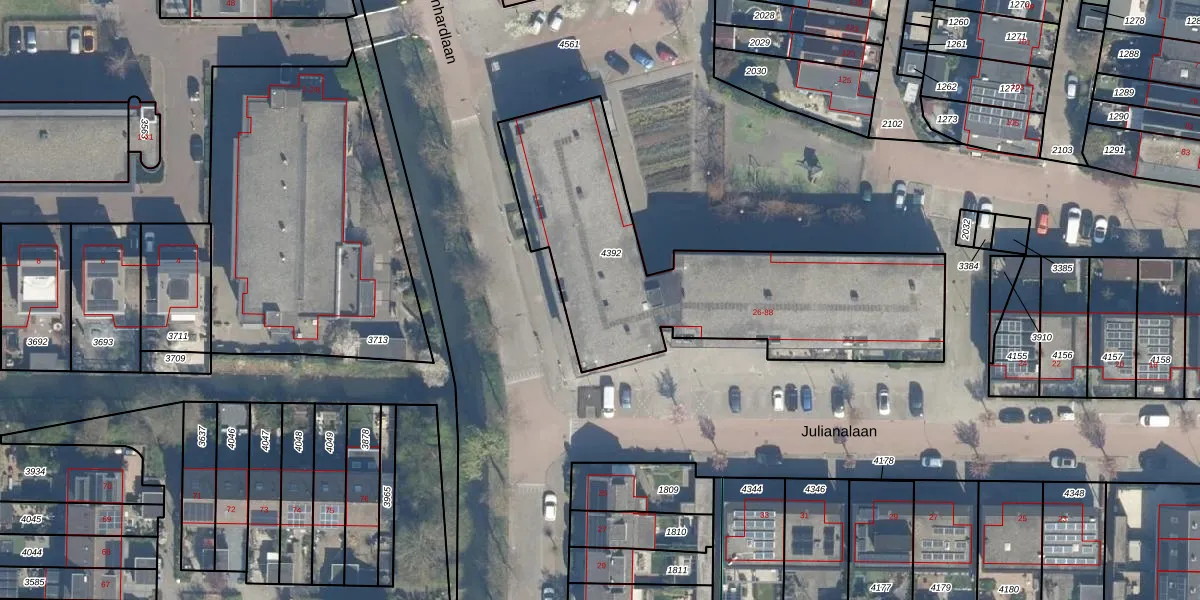 Julianalaan 54 is gelegen op kadastraal perceel HML01B4392. Deze kadastrale aanduiding is uniek en wordt gebruikt door het Kadaster om eigendomsrechten en andere zakelijke rechten vast te leggen. Het perceel maakt onderdeel uit van de kadastrale gemeente Harmelen.