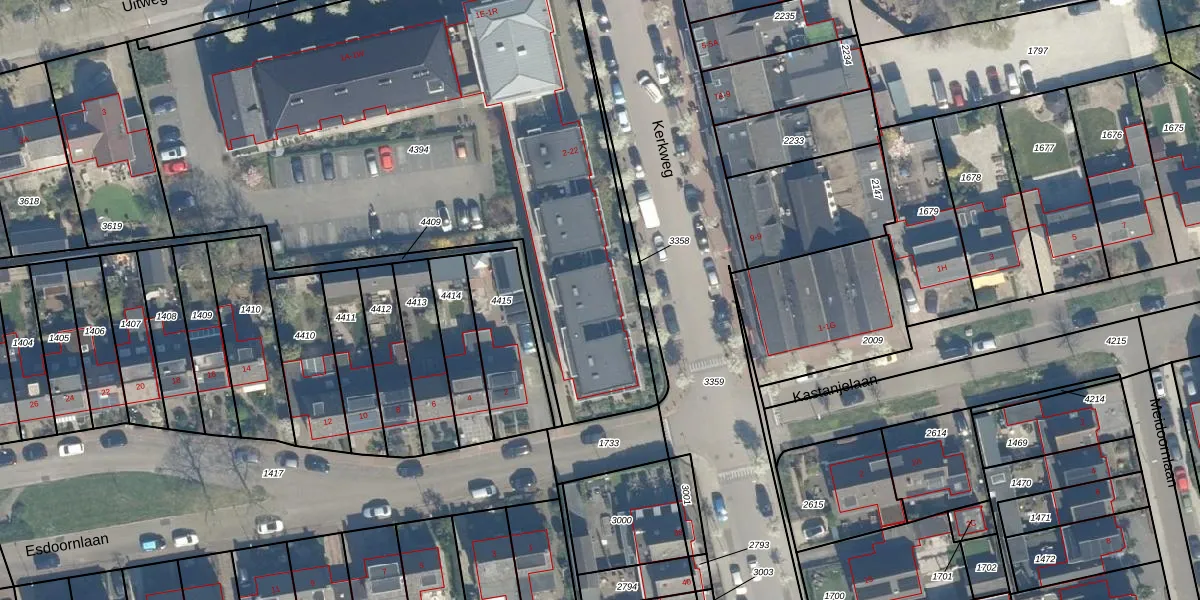 Het perceel waarop Kerkweg 4 staat heeft een oppervlakte van 3640 m². Dit is een zeer groot perceel. De perceeloppervlakte wordt geregistreerd door het Kadaster. Gedetailleerde informatie over de maten van dit perceel kunt u vinden in het rapport Kadastrale kaart met maatvoering van Kerkweg 4.