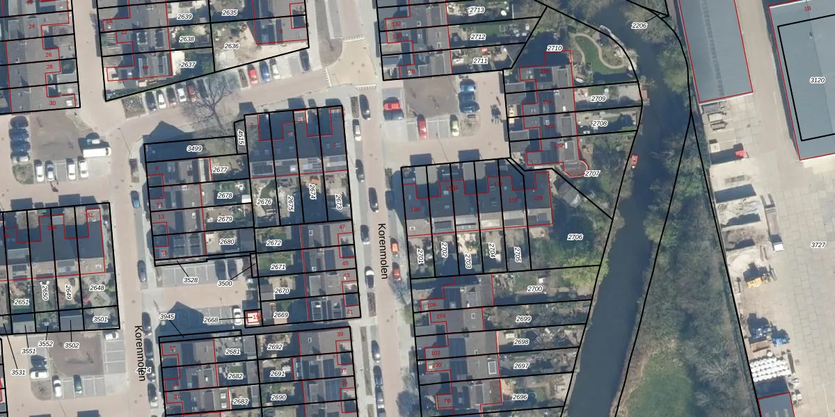 Het perceel waarop Korenmolen 108 staat heeft een oppervlakte van 163 m². Dit is een middelgroot perceel. De perceeloppervlakte wordt geregistreerd door het Kadaster. Gedetailleerde informatie over de maten van dit perceel kunt u vinden in het rapport Kadastrale kaart met maatvoering van Korenmolen 108.