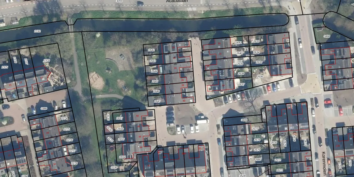 Het perceel waarop Korenmolen 28 staat heeft een oppervlakte van 156 m². Dit is een middelgroot perceel. De perceeloppervlakte wordt geregistreerd door het Kadaster. Gedetailleerde informatie over de maten van dit perceel kunt u vinden in het rapport Kadastrale kaart met maatvoering van Korenmolen 28.