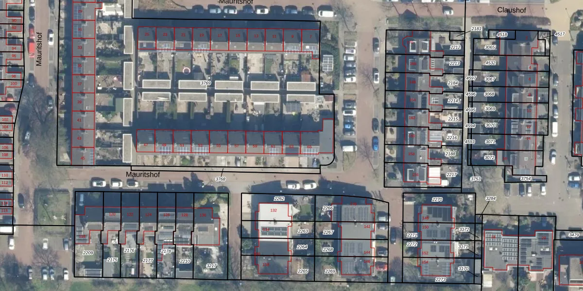 Het perceel waarop Mauritshof 63 staat heeft een oppervlakte van 4932 m². Dit is een zeer groot perceel. De perceeloppervlakte wordt geregistreerd door het Kadaster. Gedetailleerde informatie over de maten van dit perceel kunt u vinden in het rapport Kadastrale kaart met maatvoering van Mauritshof 63.