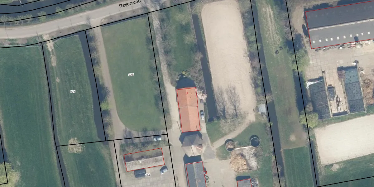 Het perceel waarop Reijerscop 12 staat heeft een oppervlakte van 1,8 ha. Dit is een zeer groot perceel. De perceeloppervlakte wordt geregistreerd door het Kadaster. Gedetailleerde informatie over de maten van dit perceel kunt u vinden in het rapport Kadastrale kaart met maatvoering van Reijerscop 12.